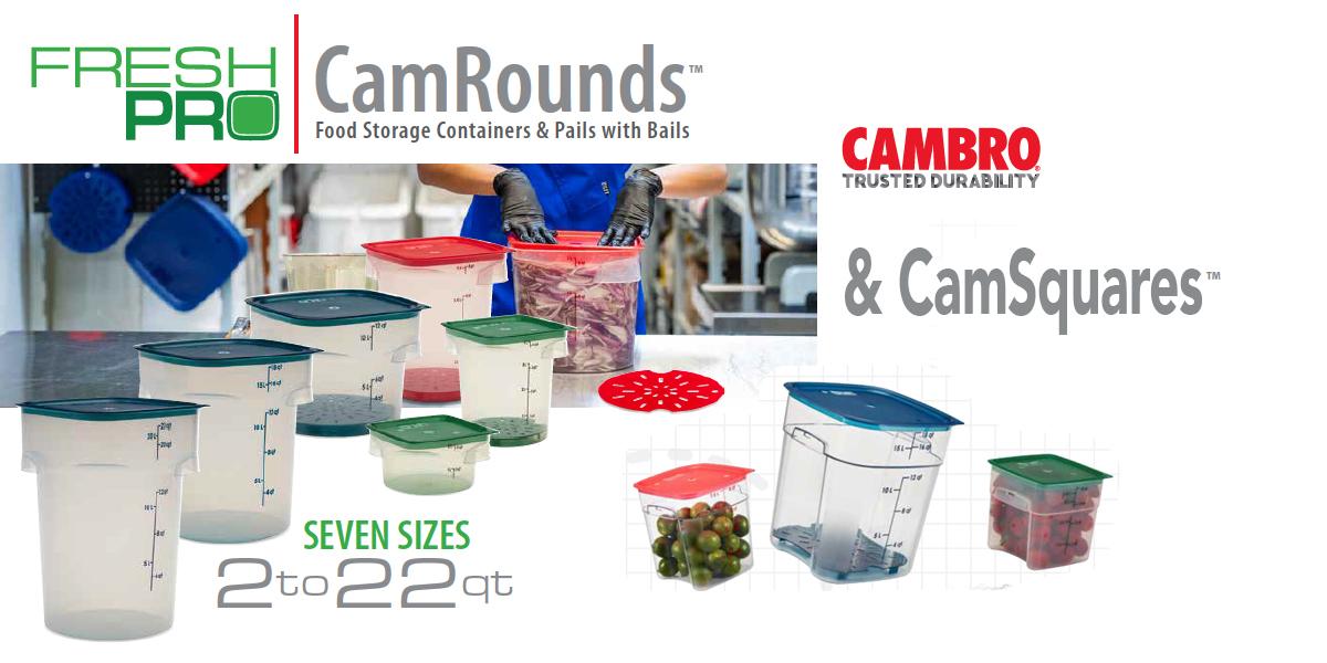 Products in the FreshPro Series include FreshPro Seal Covers, Translucent FreshPro CamRounds, Translucent FreshPro Pails with Bails, FreshPro CamRounds Drain Shelves, Translucent FreshPro CamSquares, Camwear FreshPro CamSquares, FreshPro CamSquares Drain Shelves, and Translucent 16 and 32-ounce CamSquares Reusable Mini Storage Containers. All products in this series are NSF listed, made in the USA, BPA-free on translucent containers, and dishwasher safe.